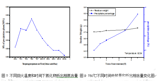 氮化物析出影響不銹鋼的耐腐蝕性能和沖擊韌性,因此氮化物析出相的含量測定對研究2205雙相不銹鋼的性能有著重要的作用。通過XRD結構分析知道,析出相中的氮化物為Cr2N,通過測定析出相中氮總量除以電解量可以得到不同回火條件下析出相中氮的百分含量。為了避免回火過程中的增氮,實驗考察了試樣在不同回火溫度和時間下的氮含量,發(fā)現(xiàn)氮的含量并沒有顯著的變化,多次測量結果的平均在0.154-0.157 %之間,因此可以證明試樣在回火處理的過程中沒有出現(xiàn)增氮和逸氮的現(xiàn)象。通過氧氮分析儀對電解殘渣含氮量的測定可以得到不同回火溫度和時間下氮化物析出相的氮含量(見圖7),氮化物的析出主要在600-850 ℃之間,從樣品的析出相氮含量分析可知,在750 ℃回火下氮化物析出明顯,析出相中氮占電解失重的量為0.015 % 至 0.025 %,而且隨著回火時間的增加,析出相總氮含量先增大后減小,而當溫度在850℃時,隨著回火時間的增加,氮化物析出相呈明顯下降的趨勢,特別是到950℃回火,氮化物析出相當少。圖8顯示,在電解條件一致的情況下,不同時效時間樣品的電解量變化不大(750 ℃時介于0.70—0.74之間)。而在考查的時效時間范圍內(nèi),析出相的百分含量隨時間的延長呈明顯上升的趨勢(從1小時的0.93 %逐漸上升到7小時的5.08 %),根據(jù)氮的分析結果可知在該時效條件下氮含量變化并不明顯,因此,隨時效時間的延長,金屬間相含量有顯著的增加。